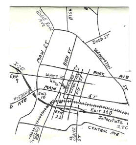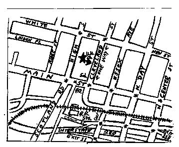• If you have come on the train from the direction of New York, exit the station through the parking lot, keeping the Post Office building on your left.   Cross Main Street at Tony Galento Plaza, and go north on Cleveland Street, half a block.